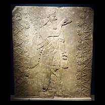 The genie is a type of protective spirit that the ancient Assyrians were rather fond of. This particular variety (and there were many kinds in various postures) depicts a powerfully-built human figure with a pair of wings sprouting from his back. The genie (which is just under 2.5 metres high, and around 2 metres wide) was carved onto a stone relief or panel around 3,000 years ago ‒ it once adorned the walls of the palace at Nimrud, near modern-day Mosul in northern Iraq. Nimrud has a long history, but one of its claims to fame is as the seat of Ashurnasirpal II, the king of the Assyrian Empire from 883 - 859 BC. During his reign, he took his palace home decor to a new level and had many public spaces and rooms at Nimrud filled with these genies. Stretched over the genie’s midriff is a block of cuneiform in the now extinct language, Akkadian. The text is what’s known as Ashurnasirpal’s Standard Inscription and he had it etched across many of his palace reliefs. Click on the image below to hear how King Ashurnasirpal's message sounds when spoken aloud.