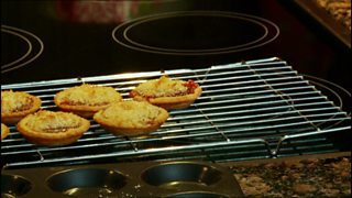 Roilig a-mach an taois agus geàrr suas e ann an 6 cearcaill mhòra. Cuir na cearcaill phastraidh air treidhe airson bonnaich bheaga. Cuir spàin-tì de shilidh air bonn gach cèis phastraidh.