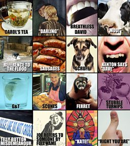 This bingo card was made using contributions from: Lynda Everington, Sharon Auerbach-Sim, Mandy Kennedy, Abi Pattenden, Susan Kay on Facebook. And @tarapersaud, @paulroome, @AndrewHornUK, @Anne_O, @t1m1964, @HemingwayDM, @politicalhackuk, @Smallmonkfish, @skybloo1, @Mrs_Bentos, on Twitter.