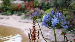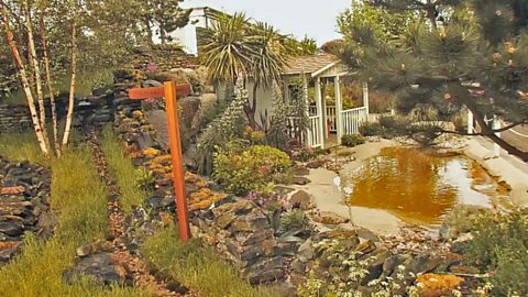 The garden is a celebration of the 50th anniversary of RHS Britain in Bloom and of Alan’s own 50 years in horticulture. The garden itself is split into two distinct areas, a raised upper section of moorland with wild turf and flowers, native hedging and Pine and Birch trees linked by a gently meandering stream to a lower coastal section where nature has been tamed to create a private haven. Palms and large shrubs provide privacy and some shade against the rocky backdrop and a small beach hut creates shelter and a place to sit and reflect.
