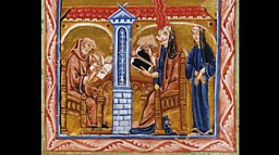 The images we have of Hildegard show her in a typical moment of ecstatic inspiration, as her transcendental visions came to her – a process of blinding, blazing intensity, as the picture shows – and as you can see, the imagery Hildegard uses appropriates that of the Pentecost to embody the moment of her divine communion: a river of flame descends from the heavens, out of the frame of the picture, and into Hildegard’s upturned eyes.