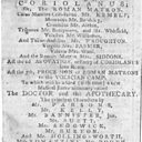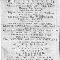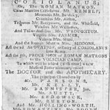 In this playbill Coriolanus is played by famous 18th century Shakespearean actor John Philip Kemble, a role to which the tall, handsome and patrician actor was well suited.