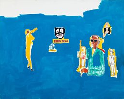 In March ’82 Basquiat had his first, very successful, single artist exhibition at the Annina Nosei Gallery, NYC. Soon he began to pick up shows in Europe and Los Angeles. Painted while in LA, this was one of a series which dealt with African American stereotypes in the entertainment business. It mixes the historical (such as ‘Sugar Cane’) with the personal (Basquiat had produced a single for rapper Rammellzee; see central figure ‘RMLZ’).