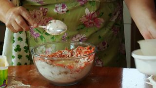 Cuir am flùr, siùcar, caineal agus pùdair-fuine tron t-sìoltachan agus dhan bhobhla. Cuir na cnothan agus currain a-steach ann agus measgaich gu math. Dòirt a-steach na h-uighean agus an ola agus measgaich a h-uile sian a’ cleachdadh spàin.