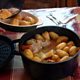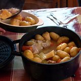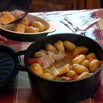 Cuir na glasraich, na h-uinneanan, dinnsear agus an creamh còmhla ris an fheòil, ann an soitheach a tha mòr gu leòr agus freagarrach son an àmhainn. Dòirt sùgh na circe agus a lionn air a mhuin agus cur e dhen àmhainn aig teas 180°C. As dèidh leth uair a thìde thoir e a-mach as an àmhainn agus cuir am buntàta ùr air muin a h-uile sian eile. Cuir mullach air an t-soitheach agus cuir e air ais dhen àmhainn airson leth uair a thìde eile gus am bi am buntàta bruich.