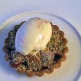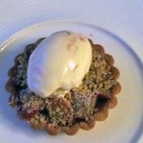 Crymbyl riwbob gyda crwst melys a chwstard melys (creme anglaise)
