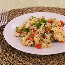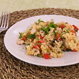 Grease a lidded ovenproof dish with a little oil and pour in the rice. Add the red pepper, spring onion, peas, mushrooms and chicken and stir until well combined.