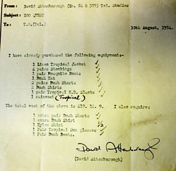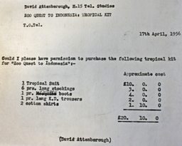 David Attenborough requests permission to purchase some tropical clothing for the 'Zoo Quest' expedition to Guiana in 1954