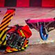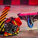 Family team Cherub quickly discovered their robot’s wings don't work when they went head to head with the powerful spinner PP3D and took out the arena wall in the process.
