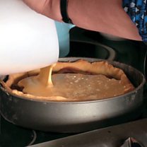 Airson an lìonadh càise buail an càise-uachdrach leis an còrr dhan t-siùcar agus na uighean agus dòirt dhan chèis-phaidh. Till am paidh air ais dhan àmhainn airson leth uair gu 35 mionaidean aig 180 Celsius.