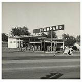 Inspired by the black-and-white photography of Walker Evans and Robert Frank, both of whom had offered distinctive, and far from celebratory, visions of contemporary American life (documenting, in Frank’s case, his own road trip across the United States in 1955), Ruscha started taking pictures of the various gas stations that he stopped at or passed during his journeys. Eventually he had amassed a group of around fifty images of gas stations, mostly taken in 1962.