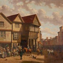 The hall had formerly been used by the St George’s Guild and remained in use until the early 19th century when it was demolished and a new town hall built on a different site. A historic plaque marks the site of the former Guildhall. A charming painting of the guildhall by Richard Sharland shows us what it looked like just before its demolition.