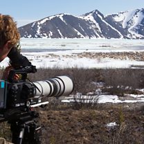 Glancing at a map and using some calculated guesswork about which valley we thought the herd would travel down, we hiked eight miles to get into position. By now it was 4am, but with 24 hour daylight it seemed like mid afternoon. I sat with my bug net on in a deserted landscape praying that the herd would come my way. Apart from the buzz of mosquitoes it was silent and I was convinced the caribou had given us the slip. Then, in the distance, I heard a rumbling noise and I saw a cloud of dust enveloping the hillside and the sheer numbers of caribou pouring into the valley were almost impossible for my eyes to compute. Moving like one organism the whole herd had come together and we were engulfed and completely surrounded by perhaps as many as 200,000 animals. For nearly thirty minutes a constant stream of caribou passed us by. Mothers, new calves and bulls sometimes almost too close to film, it was truly mesmerizing and something I will never forget.