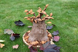 Once baked I left the biscuits to cool and made some brown royal icing. Then very carefully I stuck them on the branches of the tree. To finish I crumbled some left over cake and biscuits on the board.