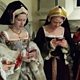 By the time Jane Seymour married Henry VIII the gable hood was going out of fashion, in favour of the more flattering French hood (worn by Anne Boleyn in her portrait). However Jane was conservative and preferred the English style (probably partly to emphasise her difference from Anne), and she insisted that her ladies in waiting wore them, too. It is rare to see these headdresses, properly made, in costumed productions and the programme team and I were determined to get them right! We even dressed the women's hair under their hoods in the correct period fashion, binding their plaits together with long linen strips.