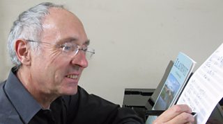 Aled sy'n cael ei wers cornet gyntaf gan Gwyn Evans, Cyfarwyddwr cerddorol band pres Biwmares.