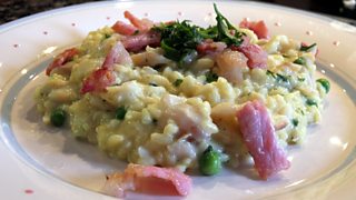 - Cuir crathadh dha na pìosan pancetta air muin an risotto.