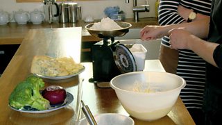 Cuir cèis taoise amh ann an soitheach airson tort neo quiche. A-staigh dhan sin dòirt am brocaili agus an t-uinnean dearg.