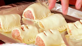 Sìn a-mach am pastraidh le roilear ann an cumadh ceart-cheàrnach agus an uairsin geàrr suas e (a’ gearradh tarsainn an taobh ‘s giorra) airson 4 ceart-cheàrnaich a dhèanamh às an taois. Cuir spàinean dhen fheòil isbein ann am meadhan na taoise agus an uairsin paisg na taoise tarsainn. Cuir suathadh dhen ugh a th’air fhàgail aig na h-oirean agus cleachd forca airson na h-oirean a dhùnadh. Geàrr gach rolag gu timcheall air 5 ceudameatair de dh’fhaid agus dean toll ann am mullach gach rolag isbein. Cuir suathadh dhen ugh air uachdar gach rolag mas bruich thu iad san àmhainn airson 20 mionaid.