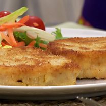 The mixture then needs to be rolled into 4 burger-sized balls. Flatten the balls slightly. If you like, you can coat them with breadcrumbs.