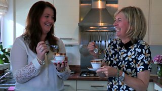 Nuair a tha iad deiseil sgeadaich iad le spàin-bheag làn crème fraiche no uachdar dùbailte agus beagan teòclaid mìn.
