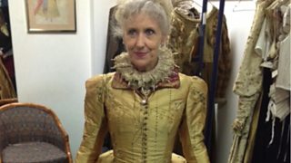 The director, Tim Dunn, told me he would like Queen Elizabeth I to wear a total of 3 dresses, plus nightwear and also rags for the nightmare sequence. When I first chose the costumes the part had not been cast and I took the risk of choosing 4 dresses that ideally I would like the actress to wear, without knowing her size. These had been primarily made for Helen Mirren and had a very tiny waist.