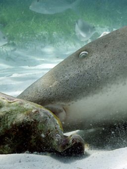Nurse sharks are particularly unassuming sharks, often seen lying motionless on the seabed, or under rocky overhangs. But when it comes to finding a mate, they really start to liven up. Nurse sharks have very complex courtship rituals. It begins with a male grasping a female’s pectoral fin in his mouth to try and maneuver her into a mating position. But the female has other ideas, and rolls over, forcing the males face into the sand. The male has to let go of her fin or he’ll suffocate. It seems that females will do all they can to try and avoid male attention, often going into dangerously shallow waters just to get away. But persistent males that share the same genes will even form co-operative groups, and working together they will try and block off her escape route into shallow water. When one of the males maneuvers the female into a mating position, the rest of the males will leave the pair alone to mate. It seems that in the race to pass on their genes to the next generation, “bands of brothers” will give up their own opportunity to mate with a female, and let their male relative pass on their genes.