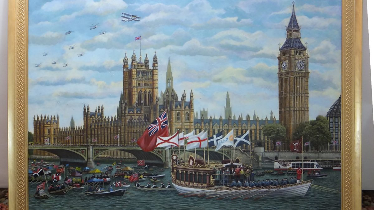An 81-year-old retired tool maker with no formal art training has painted an impressive depiction of the Thames Diamond Jubilee Pageant, but with a much more sunny outlook.