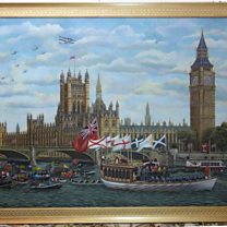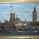 Using some artistic licence, Kenneth chose to paint the royal barge Gloriana passing by The Houses of Parliament, but this time with blue skies.