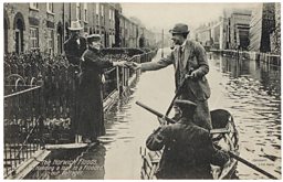 The first picture postcard was sent in 1840 by Theodore Hook to himself. While there is no confirmed reason as to why he did this, many have theorised that it was a practical joke. However postcards didn’t reach mainstream popularity until the turn of the 20th century. Postcards were cheaper to send than letters, and so were the method of choice for communicating about places you had visited. Photographers rushed to take as many photos as possible of pretty much anything and everything: to meet this whirlwind of demand, postcards became akin to single frame documentaries, used to record events or just the local population. Highlighting these are the following two images from Kasmin’s Wreck collection. They depict the dropping of the Jeanne D’Arc bell during its transportation from the Paccard Foundry in Annecy to Rouen, and the distribution of bread after the Norwich Floods of 1912, respectively.