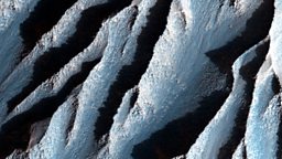 The striking blue colour is the result of the HiRise camera’s ability to capture light beyond the visible spectrum, so it is also seeing infrared and ultraviolet light. To human eyes it would appear closer to the red hue we are more familiar with.