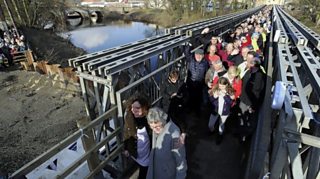 Tadcaster Bridge, the 18th century road bridge over the River Wharfe in Tadcaster collapsed during the Christmas floods on 29th December last year, splitting the town in two. There is a temporary footbridge, which has been built in sections over the river and which will play host to Rebecca Newman for BBC Music Day.