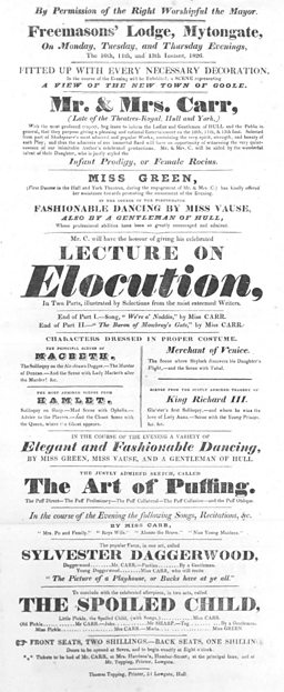 The performers are Mr and Mrs Carr, visiting actors who have performed in the region, at the York and Hull theatres. With them is their daughter, the “Infant Prodigy” or “Female Roscius” – a title which actors often appropriated as it refers to a Roman actor of renown, so conferred gravitas on the performer.