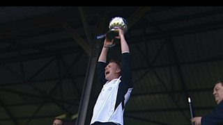 Derek 'Pluto' Moireach ag aithris air ball coise ionadail nan Eilean