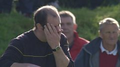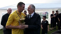 Derek 'Pluto' Moireach ag aithris air ball coise ionadail nan Eilean