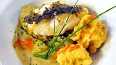 Actor Ricky Groves talks about his early career as a chef and makes cod boulangere with roasted garlic, and Si and Dave plate up a warming coq au vin rouge.