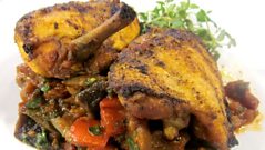The seven-minute supper is Boston baked beans with potato cakes. Actor James Redmond is the special guest, he makes a dish of spicy griddled chicken and Si and Dave make an upside down winter pudding.