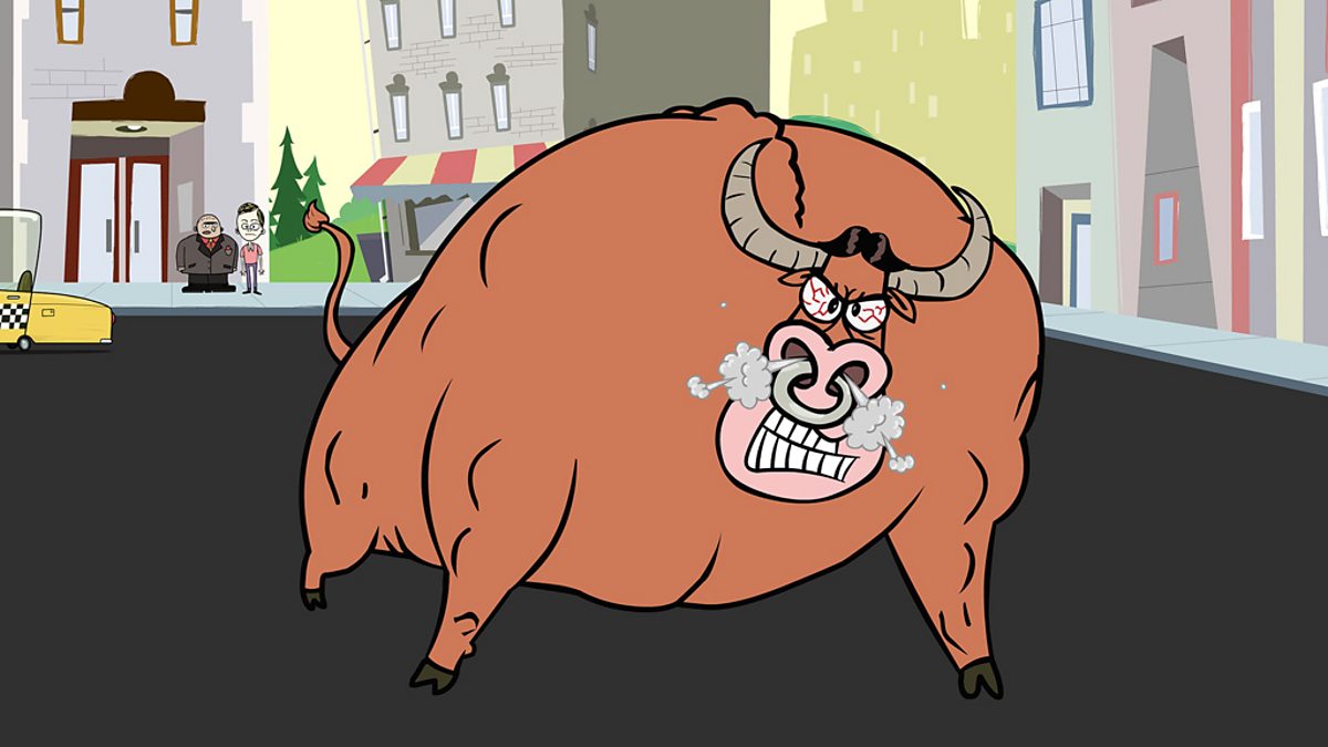 Comedy animation. Mother Goose has stolen all the modern art from the P-Town art gallery, even its prize exhibit, the painting, Cow on a Moped.