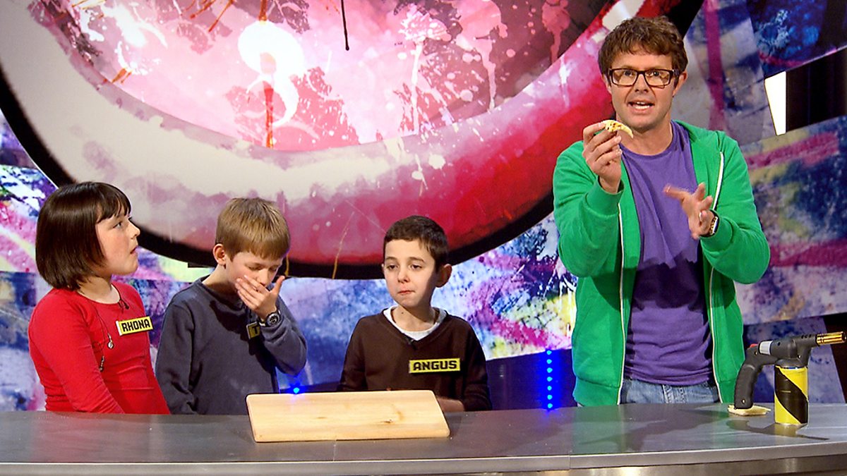 Stef and his studio audience discover foods that taste better burnt. They also sample the world's craziest canned foods and produce a paddling pool-sized pudding.