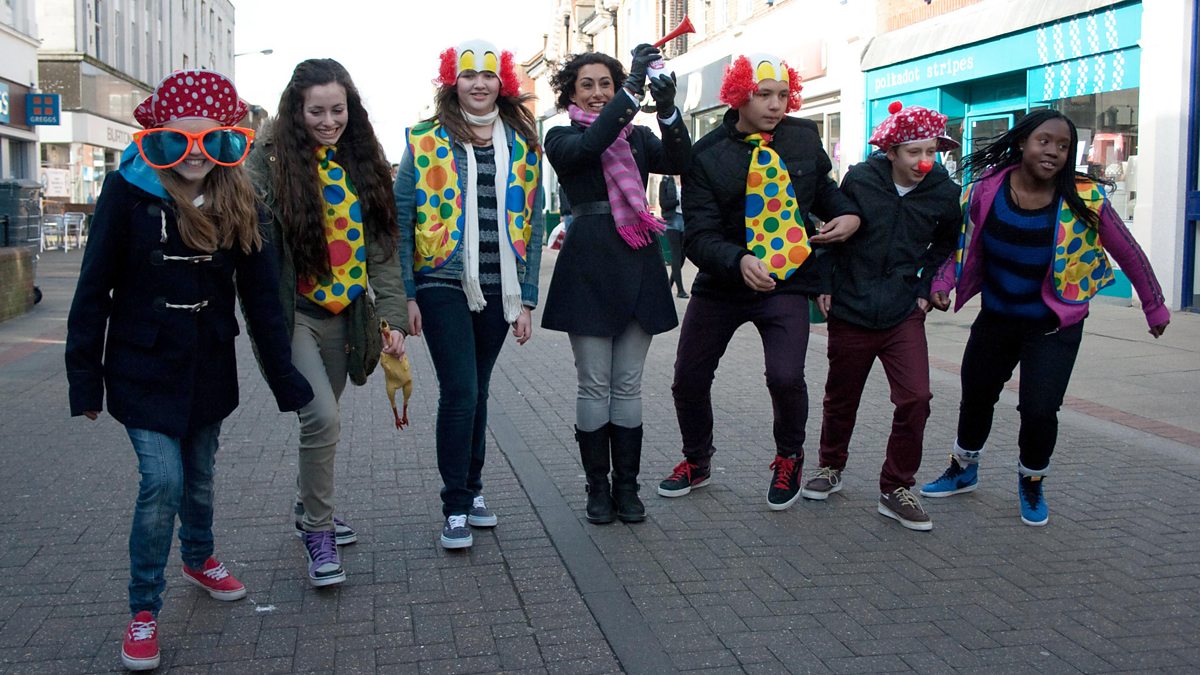The search for the best young traders in Britain. It's the second semi-final and the challenge is to sell red nose accessories at the Bognor Regis Clown Convention.