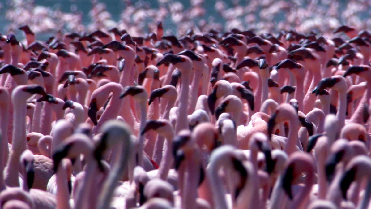 This short film shows swarms of flamingos moving around and displaying their long necks - this is the spectacle of their courtship ritual. The flamingos walk around on their long legs and fly together in the air above the mudflats where they live.