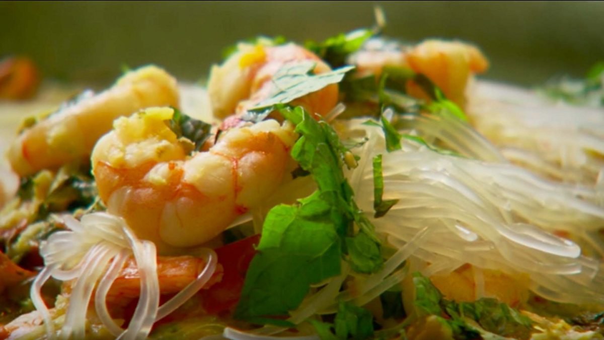 John Torode sifts through archive cookery clips linked by the letter N. Featuring Nigel Slater's prawn and noodle soup and Raymond Blanc's greengage nougatine.