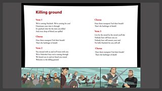 | 02 51 Part 1 | Learning Verse 1, beginning: 'We're coming Macbeth, we're coming for you...' which is sung by Malcolm's army as they march on Macbeth. The words are learnt line by line before putting the whole verse together and repeating with the chorus. |