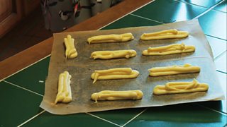 Tha Màiri Alice Bartlett a’ dèanamh am pastraidh airson na h-eclairs seòclaid gheal aice