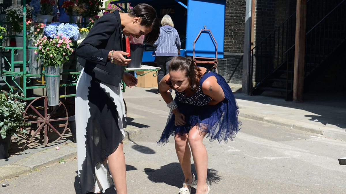 Drunken Tina catches up with Tosh on Bridge Street; she tries to explain but throws up on Tosh’s ball dress. Tosh storms to the Vic. Alfie’s irked when a fuming Tosh impinges on his boys’ night with Terry, moaning that Tina’s made her miss her work ball. Over darts, Tosh confides that she wants to settle down and have kids, but feels Tina will panic if she brings it up. Alfie can’t help feel for Tosh and suggests she could always have a kid on her own. Tosh realises she doesn’t want a family without Tina, and, on Alfie’s advice, heads off to find her.