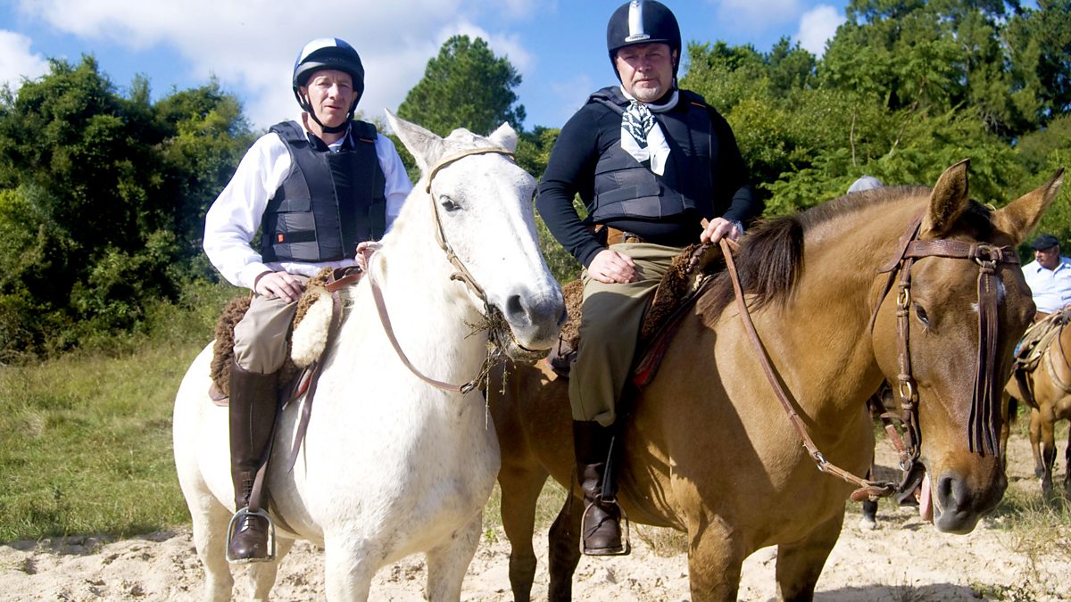 After a hair-raising, pothole-dodging drive with Simon at the wheel (he only passed his test in his forties), they arrive at La Pelada Estancia near the small town of Esquina, their home for a week of intense training. The ranch, on the banks of the Corrientes River, employs a dozen gauchos who train over a hundred native creole horses and manage five thousand cattle. The head honcho, the dashing Dario Gallardo, soon has Argentina's newest gauchos bedecked in traditional ponchos, riding comfortably on two of the estancia's sturdiest horses.