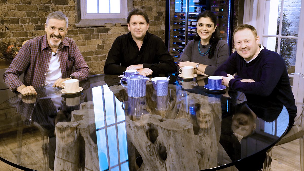 James Martin presents the weekly live cooking show with guest chefs Sabrina Ghayour and Kenny Atkinson. Griff Rhys Jones faces his food heaven or food hell.