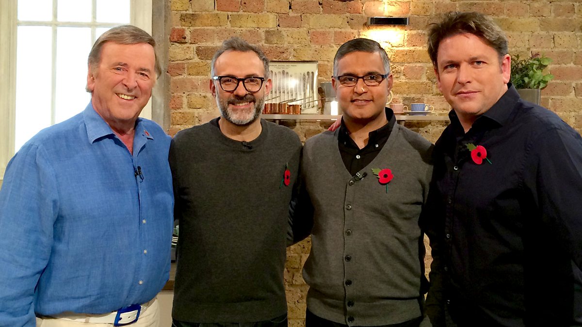 James Martin presents the weekly live cooking show with Michelin-starred guest chefs Atul Kochhar and Massimo Bottura.