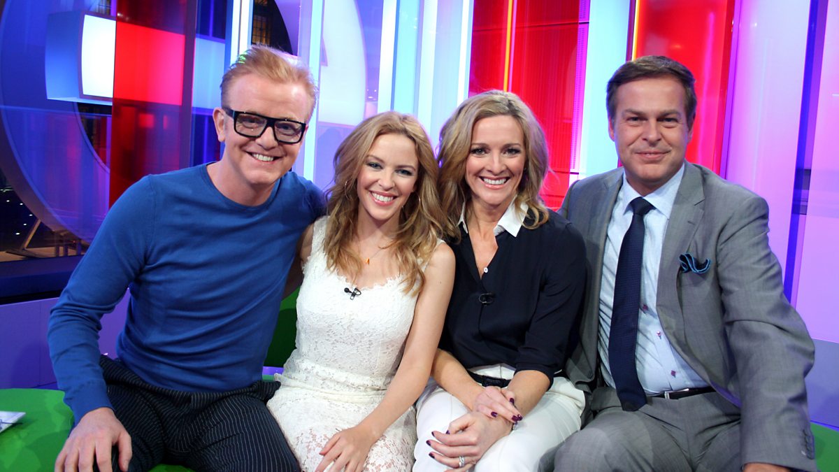 Chris Evans and Gabby Logan are joined by pop princess Kylie Minogue and Dragons' Den star Peter Jones. Ricky Andalcio investigates Britain's best sticky toffee pudding.
