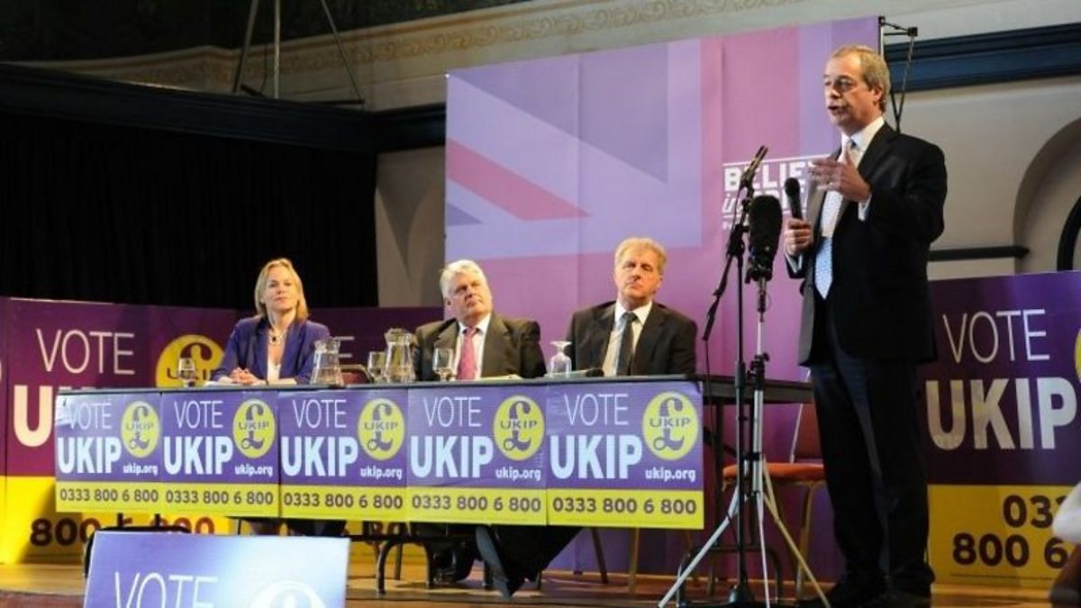 Recorded coverage of a speech by UKIP leader Nigel Farage at an election campaign event in Grimsby, from Wednesday 8 April.
